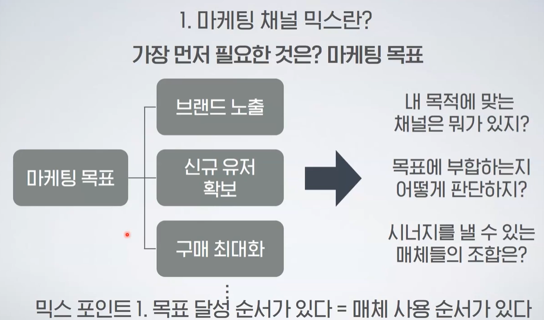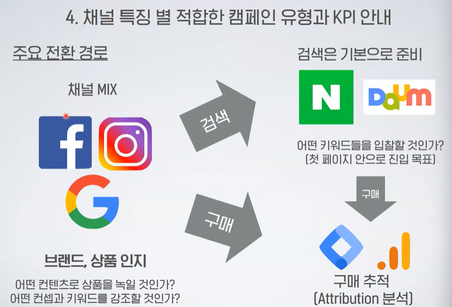 - 지표 기준으로 채널 판단 (ex. 브랜드 노출, 신규 유저 확보, 구매 최대화..)