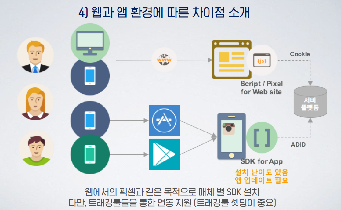 - 식별자 상이 : 웹, 픽셀은 쿠키 / 앱은 광고id(ADID) 등 별도 식별자 사용